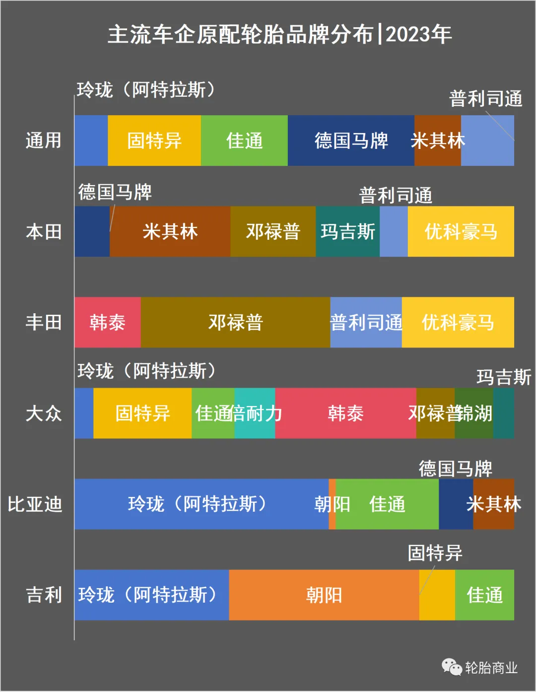 透过2023年轮胎贸易原配数据概述来看,祯祥、比亚迪等中国车企比拟倾向于中国轮胎品牌。绝顶是新动力大火之后,中国轮胎品牌发力新动力极地面助推了中国新动力汽车的成效。而丰田、本田则偏向于日系、韩系轮胎品牌,除此除外也有西洋轮胎品牌。而寰球相通偏向于西洋乌轮胎品牌,除此除外玲珑、向阳、玛吉斯等中国轮胎品牌终于挤进了寰球的原配中。